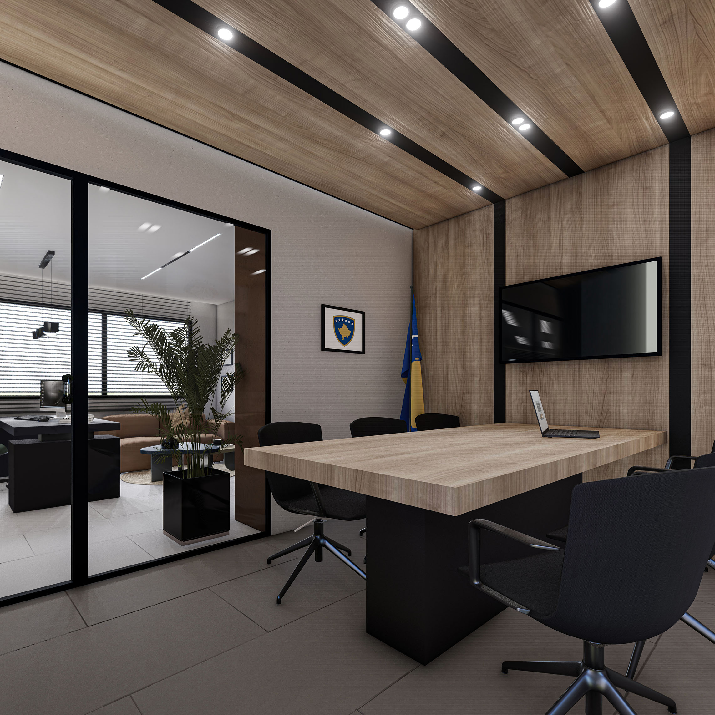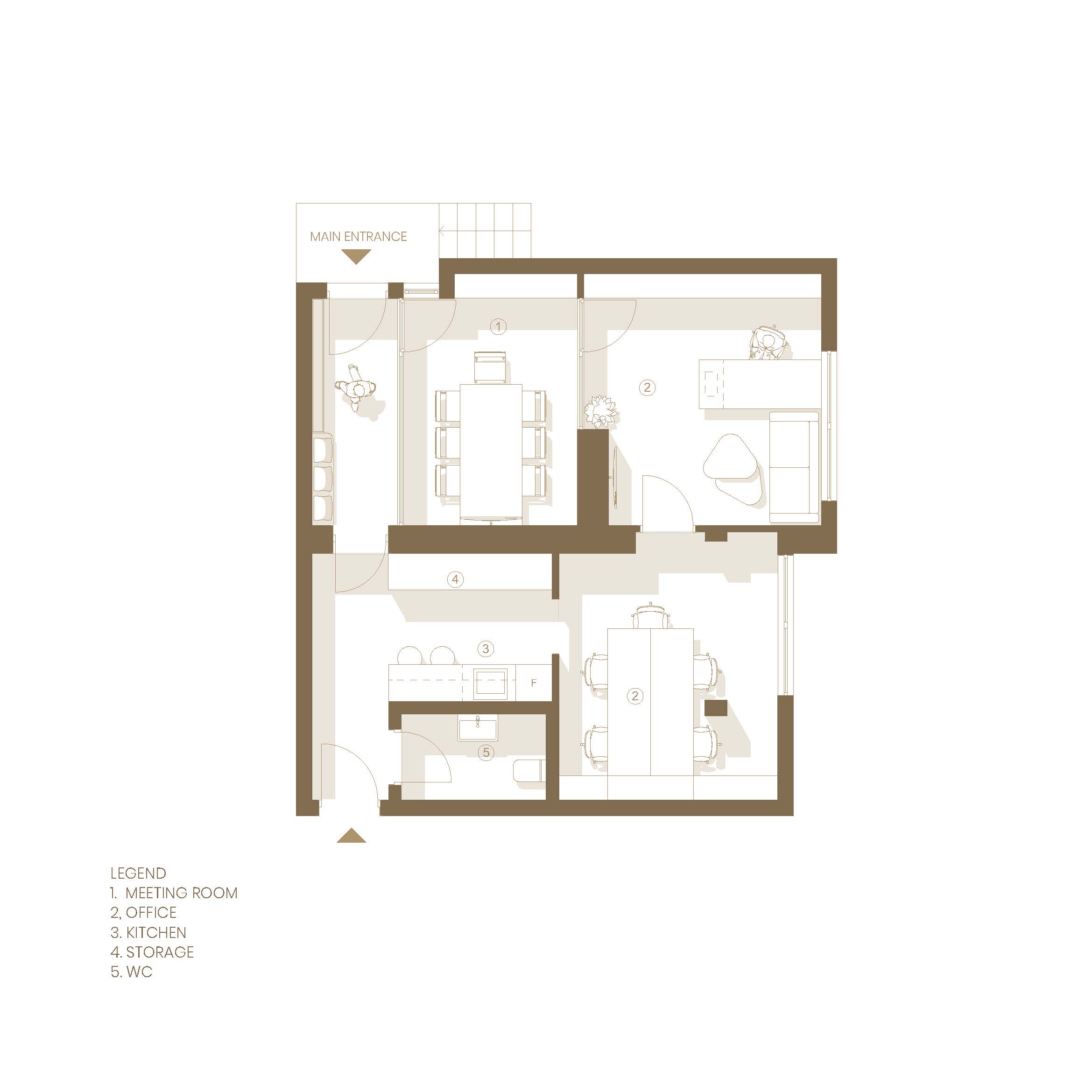 is carefully planned to integrate essential office functions, including working spaces, meeting