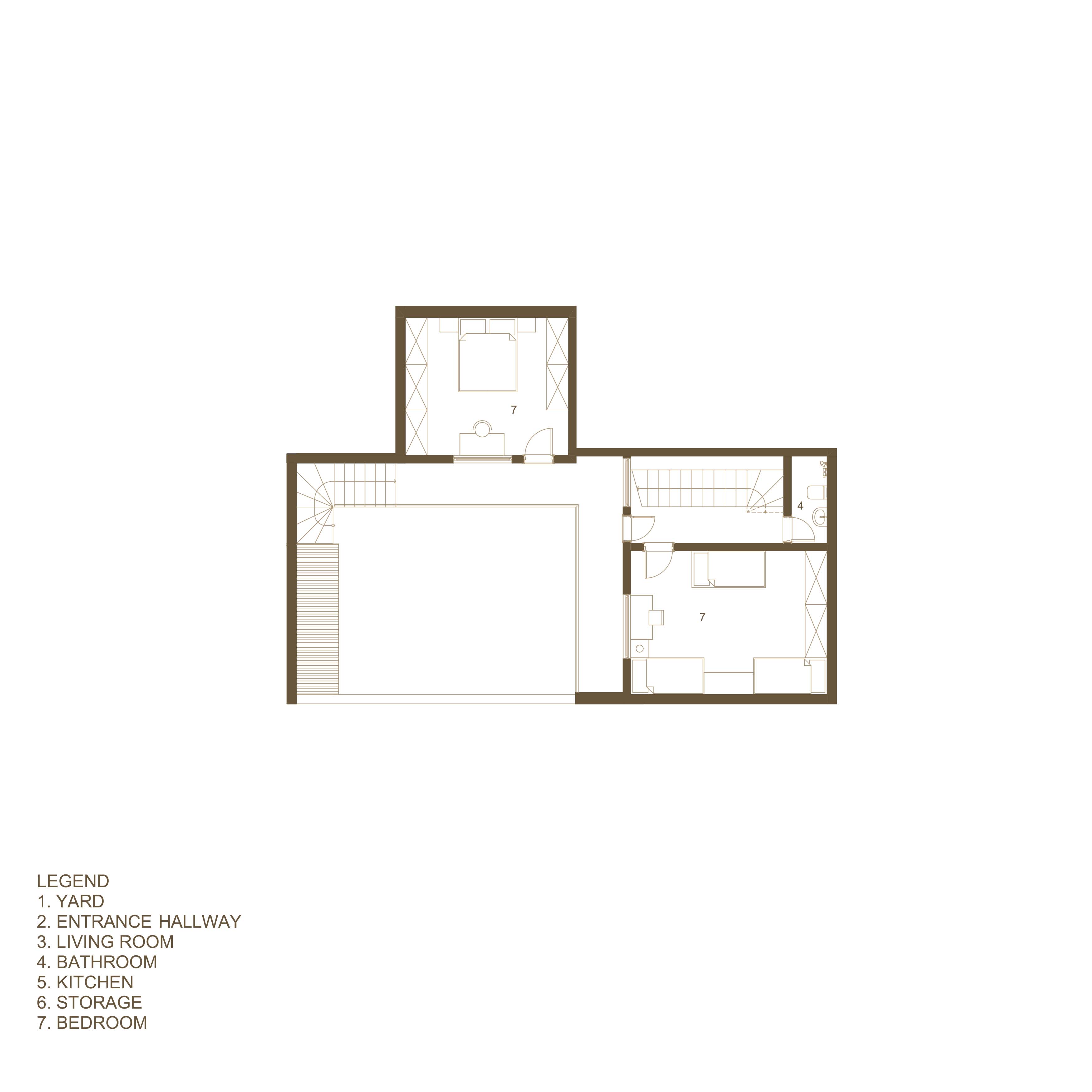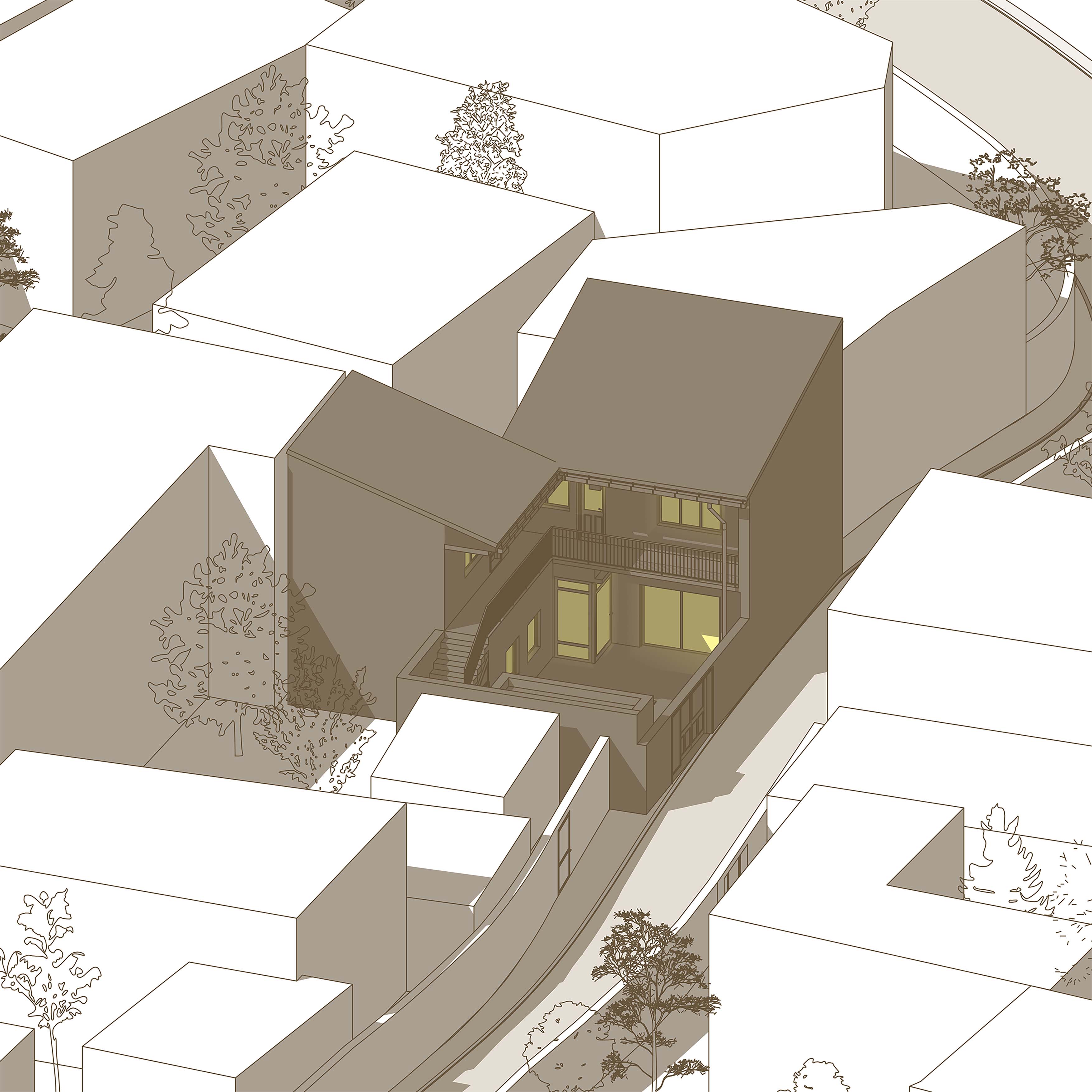 outdoor terraces and a wooden stairway that connects the two floors. The house sits within tight