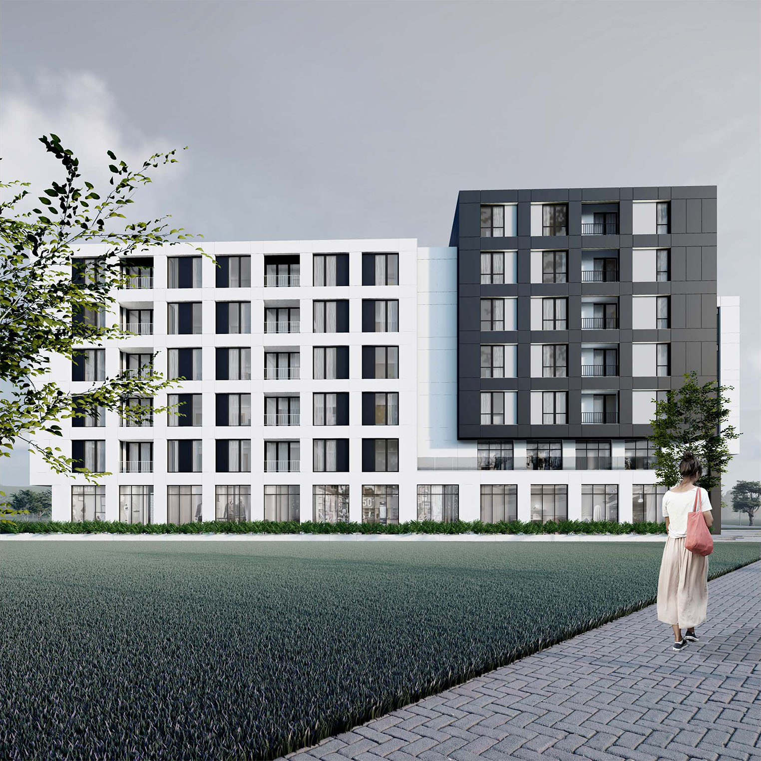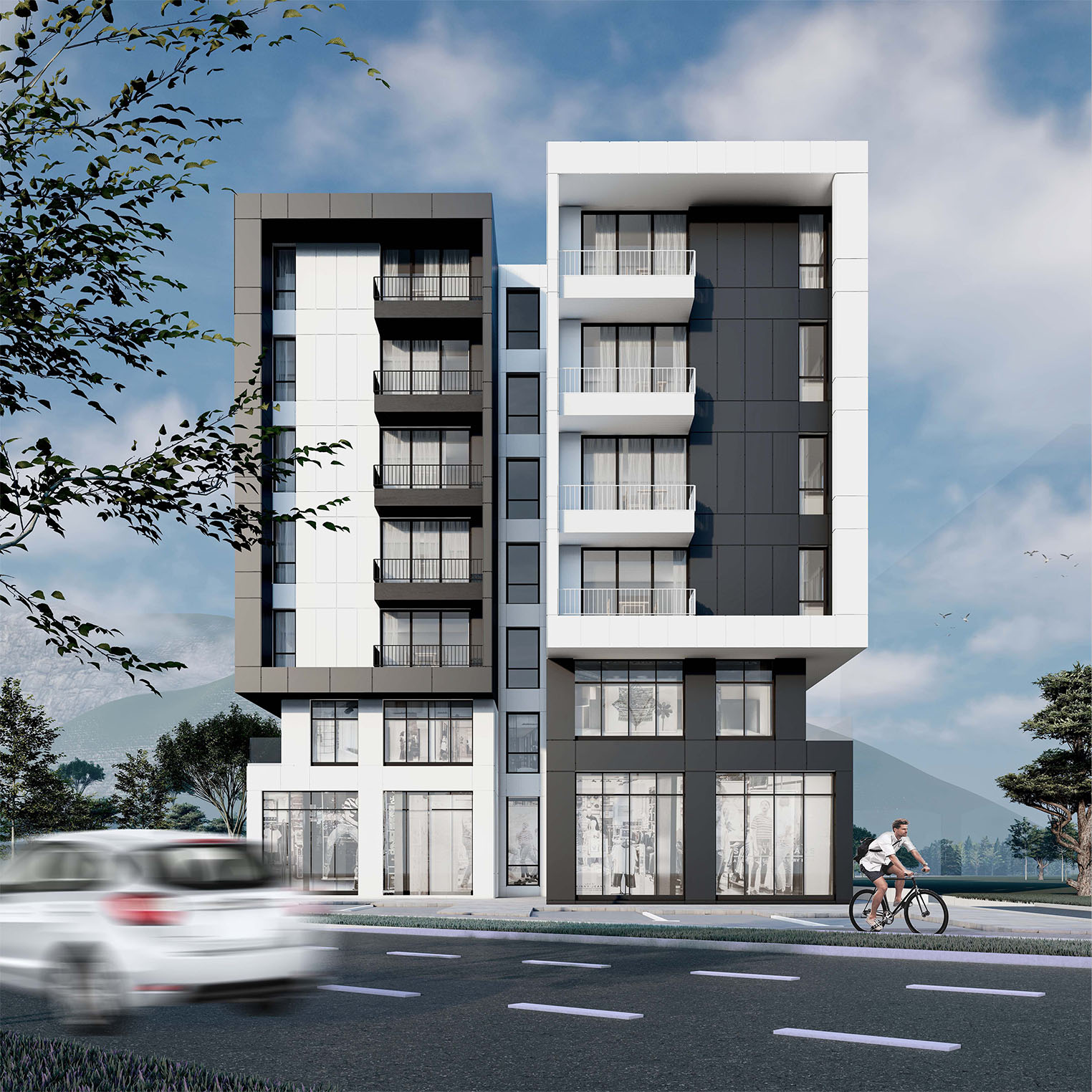 The facade integrates contrasting black and white tones, with a combination of open balconies